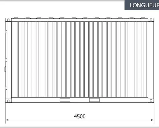 Dim ext (en m) 4,50 x 2,20 x 2,25 Dim int (en m) 4,30 x 2,07 x 2,02 Volume (en m3) 18 Capacité porteuse (en Kg) 9000 OSSATURE