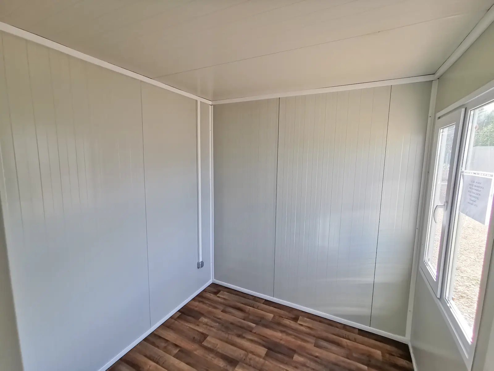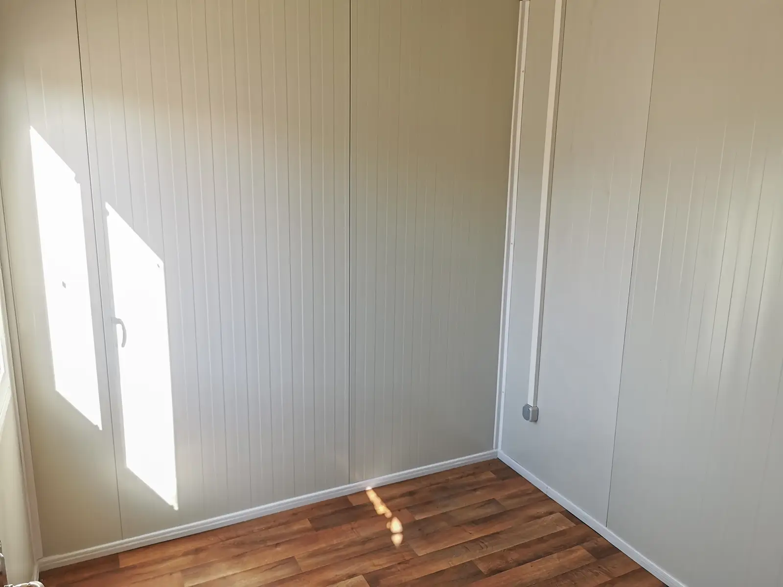 2x chambre, 1x porte d’entrée, 1x porte intérieure, 4x fenêtre, 1x toilette avec lavabos, 1x douche, 1x cuisine