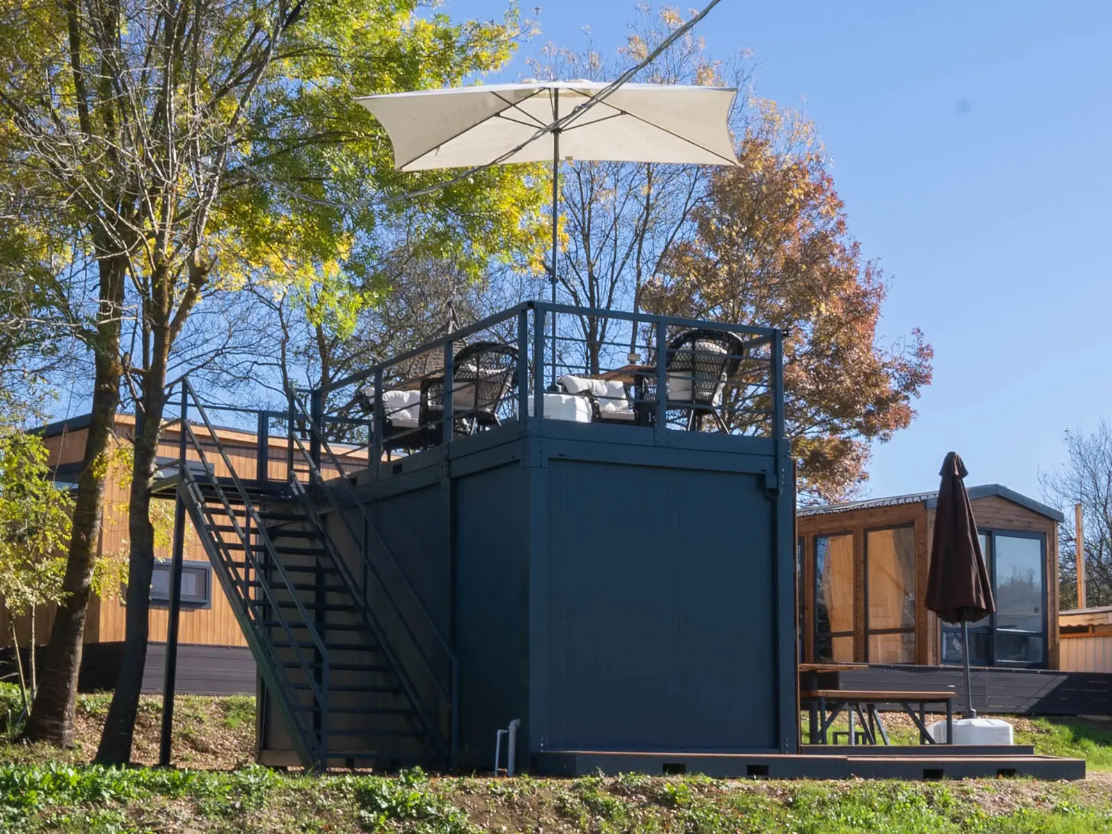 Café Conteneur Fenêtres du sol au plafond avec boiseries, 1 x grande pièce, 1 x porte d’entrée en verre plus accessoire