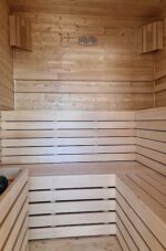 Un sauna sec en bois d’épicéa, idéal pour une détente complète.
