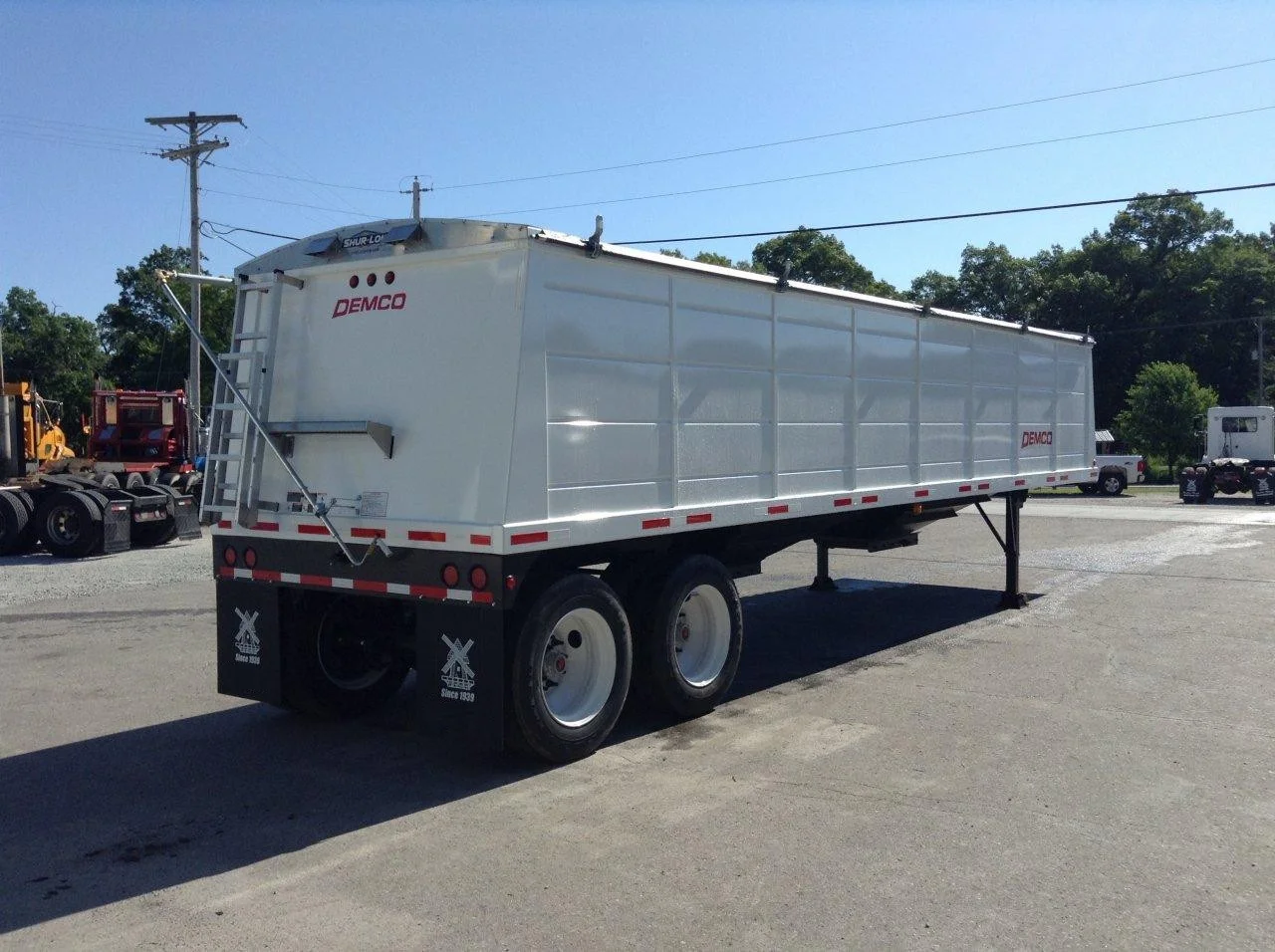 Remorque céréalière en acier Demco 2025 de 34 pi x 96 po – Hauteur latérale de 66 po, suspension à ressorts, essieu tandem, pneus 11R 22,5, roues en acier, deux trémies, volume de 1 152 pi³, boisseaux de niveau (environ) 922, boisseaux bombés (environ) 985, garde au sol de 25 po, ouverture de trémie de 30 po x 20 po, axe de 18 po, train d’atterrissage 55 à 2 vitesses, échelles et plateforme avant et arrière, barreaux d’échelle à l’intérieur de la remorque, fenêtre de surveillance, bâche manuelle, PNBV de 62 000, garde-boue, trémie ventilée, renfort Jake.