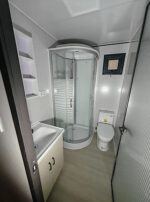 - Salle de bain complète équipée d’une cabine de douche, d’un WC compact, d’un lavabo avec meuble, et de ventilation intégrée.