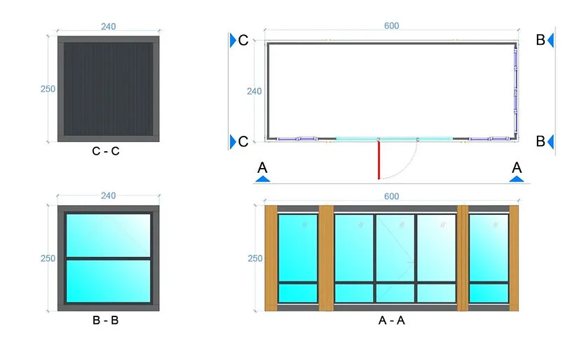 Ce module habitable comprend une grande pièce ouverte, idéale pour un aménagement personnalisé. Il est équipé d’une porte d’entrée vitrée, d’une porte d’entrée standard, de 5 baies vitrées pour une belle luminosité naturelle, d’une salle de bain avec toilettes et lavabos, ainsi que d’une cuisine fonctionnelle.